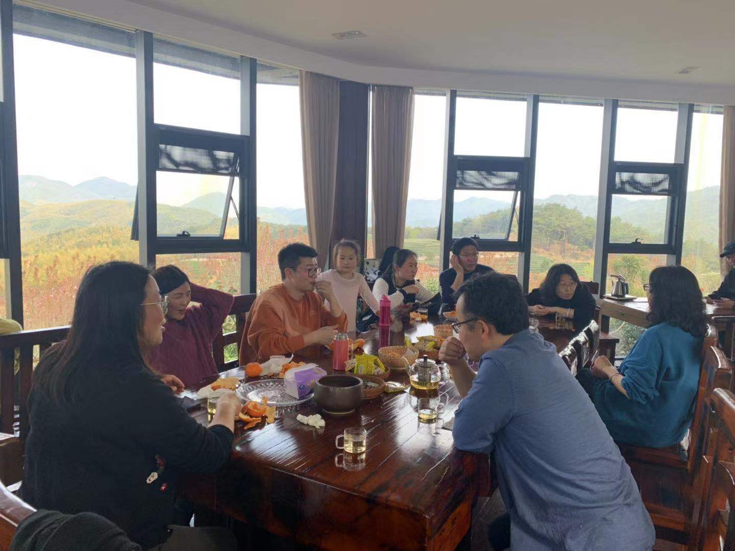 下午老师们又赴俞氏五峰茶园品茶,春天的茶园,绿树环绕,翠竹婀娜,茶香四溢。最引人注目的就是悬在空中的茶壶,没有支点却能水流不断,老师纷纷拿出手机,“打卡”留念。在山顶观景台上老师们品茗叙话,交流分享工作学习心得,在清幽茶香中度过了美好的时光。