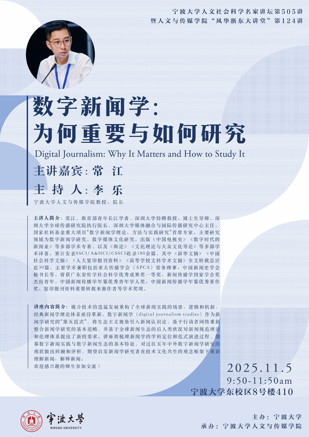 讲座内容:媒介技术的迅猛发展重构了全球新闻实践的场景、逻辑和机制,经典新闻学理论体系亟待革新。数字新闻学(digital journalism studies)作为新闻学研究的“第五范式”,将生态主义视角引入新闻认识论,基于行动者网络重新整合新闻学研究的基本范畴,并基于全球新闻生态的后人类状况对新闻规范理论和伦理体系提出了新的要求。讲座将梳理新闻学的学科定位和范式演进过程,描摹数字新闻实践与数字新闻生态的基本特征,对过往五年中外数字新闻学研究的现状做出回顾和评析,期望启发新闻学研究者在技术文化共生的观念框架下重新理解新闻、解释新闻。