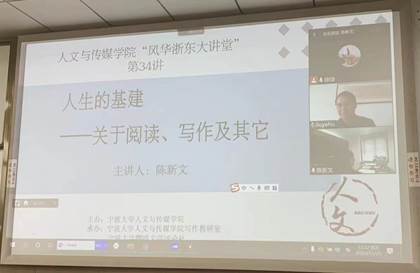 2022年11月25日下午,湖南文艺出版社社长、《芙蓉》杂志社社长兼主编陈新文应邀作了题为“人生的基建——关于阅读、写作及其它”的讲座。受疫情影响,本次活动以线上线下结合的方式进行。