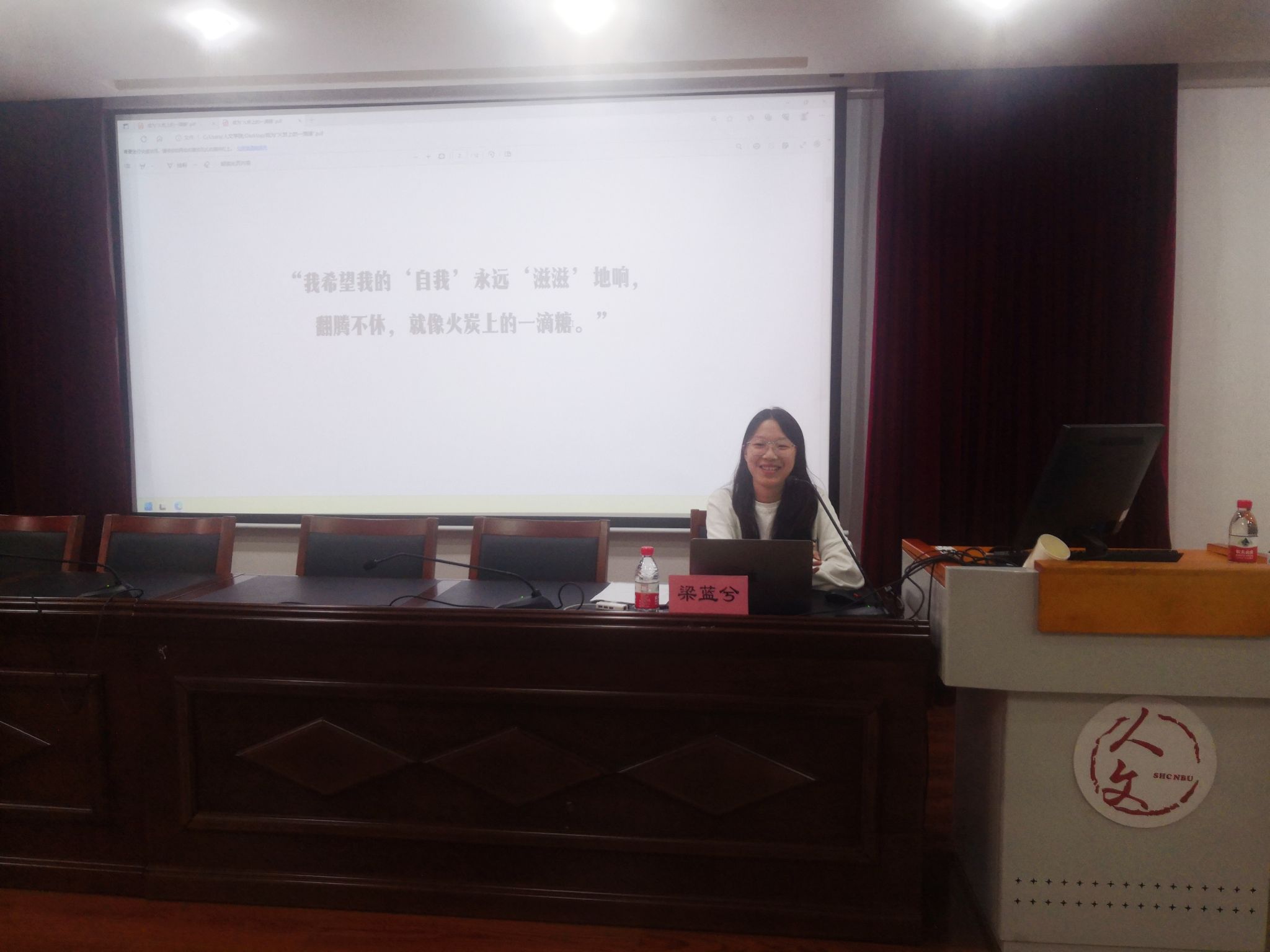 本次授课以“成为‘火炭上的一滴糖’”为主题,一如梁蓝兮对自己的期许,“我希望我的‘自我’永远‘滋滋’地响,翻腾不休,就像火炭上的一滴糖”。她以“学习是一个很广泛的定义”作为开篇,引导学员们广泛地阅读,且要边读边思考,学会合理输出,养成良好的学习习惯;结合大学科研、竞赛等经历,梁蓝兮鼓励学员们“喜欢的事情就去做,不要放过脑子里闪过的念头”;谈到身为一名预备党员,她谨记自己的使命担当,将自己的青春力量付诸社会实践和志愿服务;最后,梁蓝兮祝愿学员们能够真诚地面对生活,做甬江一般开阔、自由、奔放的人。