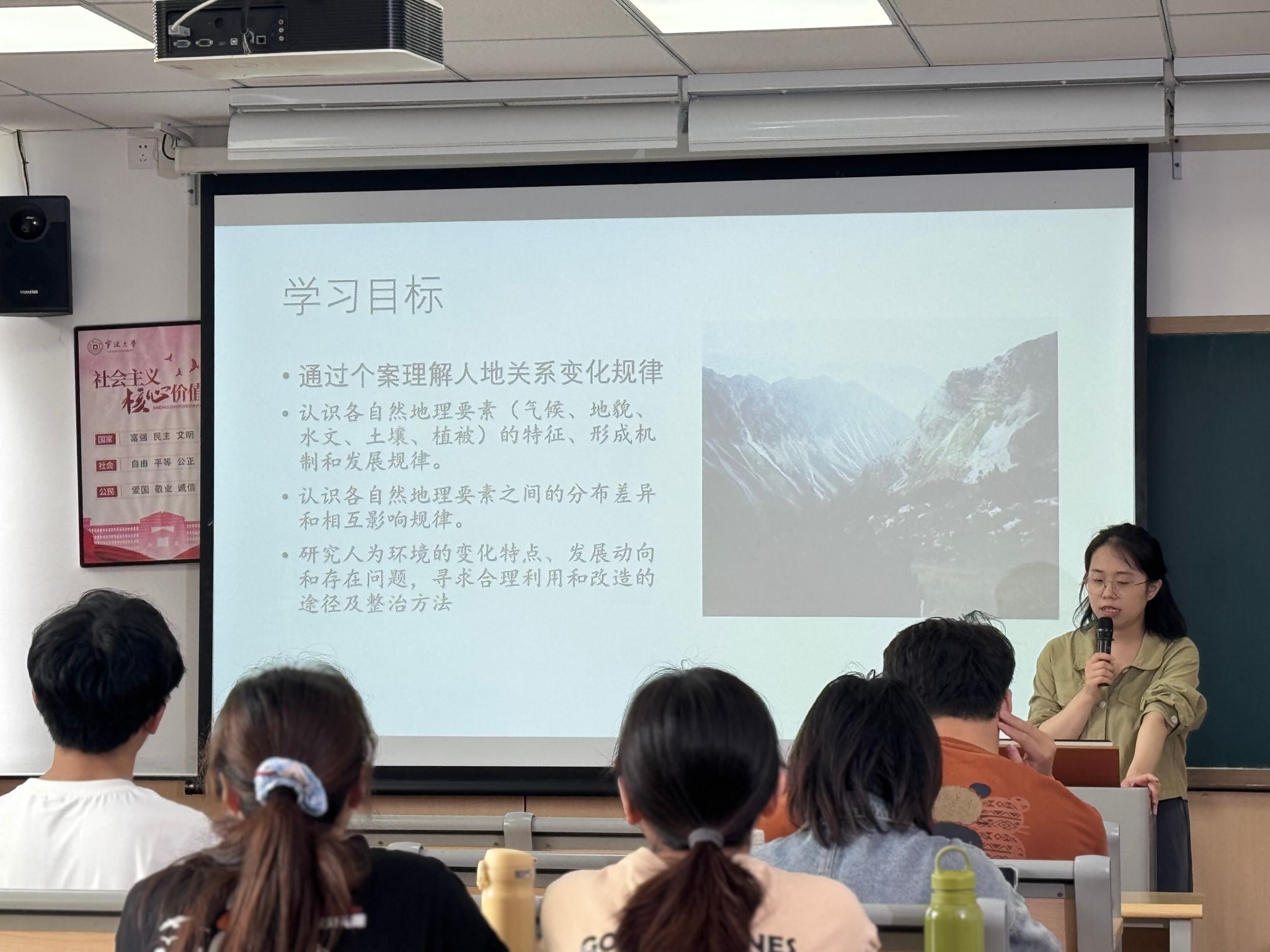 历史学系张怡雯老师在6-402教室,面向全校讲授课程思政公开观摩课——“自然地理学”,众多青年教师到场观摩学习。