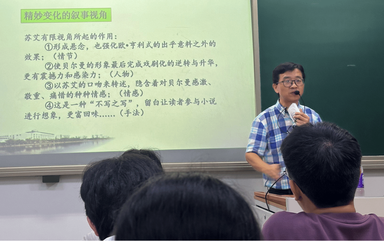 课程伊始,时老师提出“从课堂深耕到课程自觉:专业进阶,与时俱进”的理念,又进一步阐述将“课题研究”、“教学论文”、“教学论著”三者有机融合,作为致力课程自觉的重要手段,高屋建瓴地指明了语文教师的专业发展路径。之后,时老师向同学们介绍了“课脉构建法研究”、“微专题教学研究”两大核心教学方式,在本次课程中,他重点讲解了语文阅读教学中的“课脉构建法”,指出要找出每一节课的“教学支点”,将艺术的打击力量集中到一点,以此实现“删繁而就简,执一而驭万”的教学境界,破除“碎片化教学”的弊端。同时,为将理论具象化,时老师以《最后的常春藤叶》课例研究作为引子,兼以“因体而教,寻找密码”的理念,向同学们详细示范了“定核·理脉·构链”的教学主张,这一示范将抽象的教学主张转化为可感可知的课堂实践,令同学们深受启发。在此基础上,课程进一步深化,时老师引出“一即多”的教学辩证法,倡导“一课一得”的理念,向同学们具体介绍了从“单元要求、文本体式、篇性特征、生情特点”四个维度寻找“一即多”的“一”,并以《百合花》为课例做结。