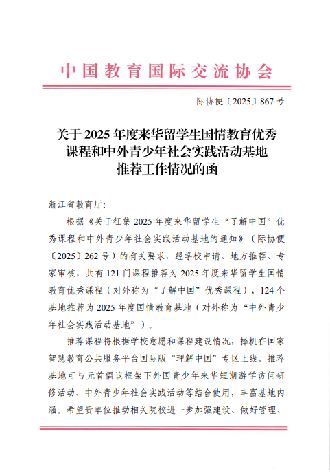 将以此次入选为契机,进一步深化课程内涵建设、打造特色教育品牌,推动优质课程资源共享,不断提升来华留学生国情教育和中国文化国际教学水平,为促进中外文明交流互鉴贡献更大力量。