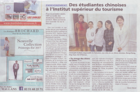 同时,近期,法国度假小城LES SABLES出版的报纸LES SABLES专门采访了人文学院在昂热大学旅游与文化学院Sables-d’Olonne校区就读的 4名13级旅游管理中法合作专业本科学生。昂热大学旅游与文化学院去年秋季在大西洋畔的度假小城LES SABLES开办了第4个校区,首期开设了海滨文化与遗产、旅游与水上运动2个本科专业,法国现外长、前总理埃罗专程前往参加揭幕典礼,还接见了在该区就读的欧美性爱