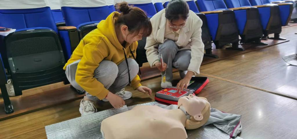 在现场体验操作时,同学们分成两组,利用模型进行操作练习,医护人员对每一位操作者每一个动作进行了认真仔细的指导,使每一位操作者真正掌握急救要点和操作手法。