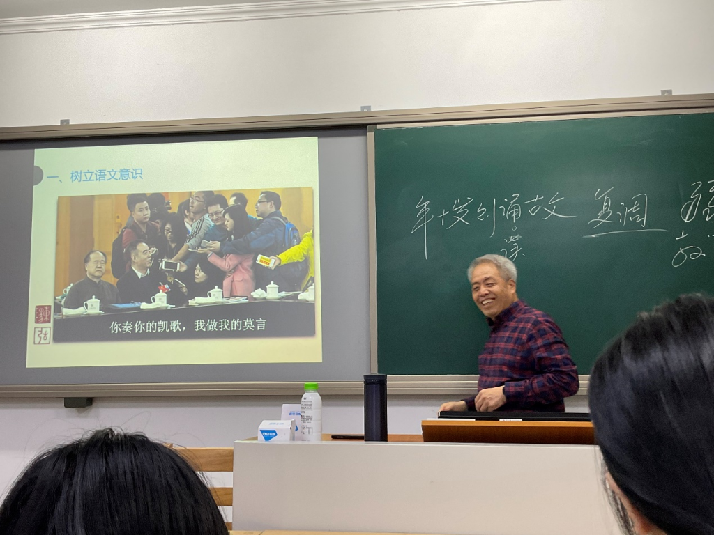 讲座开始,吴老师提出了一个问题“你有名字吗?”,简单的自我介绍瞬间活跃了整个课堂。紧接着吴老师以“年十岁则诵古文”的例子引出了同学们关于“树立语文意识”的思考,并通过几个案例提出了本次讲座的重点:教学阅读是什么,以及怎么做的问题。