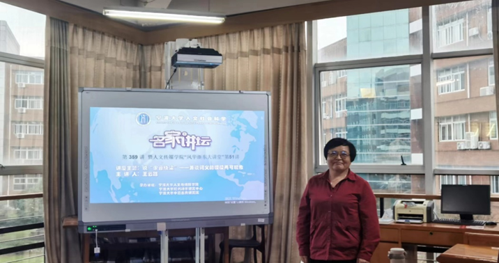 2023年10月20日下午,博士生导师、浙江大学求是特聘教授王云路老师应邀来到宁波大学人文与传媒学院,为学院师生开展了题名为“说‘余音绕梁’——兼谈词义的模棱两可现象”的讲座。讲座由中文系教授宋闻兵主持,中文系主任周景耀副教授,聂仁发教授等亦参加了此次讲座。