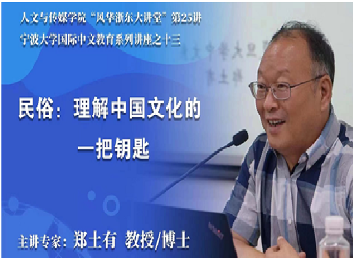 2022年10月26日下午,复旦大学中文系教授、中国民间文艺家协会副主席、中国民俗学会副会长郑土有教授应邀作了题为“民俗:理解中国文化的一把钥匙”的线上讲座,讲座由人文与传媒学院对外汉语教学部主任毛海莹老师主持。