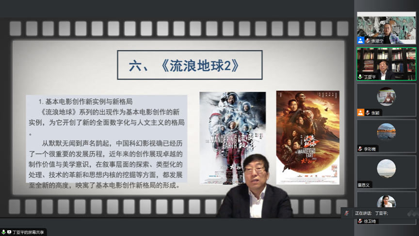 接下来,丁老师着重对“基本电影”进行了分析。丁老师指出,基本电影的发展动向,是寻求电影通史的一副绝佳的历史图景,基本电影在样态、结构上,有不同的情况。讲座以《定军山》《早春二月》《流浪地球2》三部电影为例,对不同时期基本电影的特性进行了具体分析,并以这三部电影的为基础提出基本电影的三个转向——“他者转向”、“人文/艺术转向”、“后工业转向”。丁老师指出,三个转向代表的基本电影三个方向,呈现了电影史百年来基本电影的主要变革。丁老师认为,基本电影融票房/商业与人文/艺术于一体,独具电影史上的范式意义,其中包含有一种历史性。