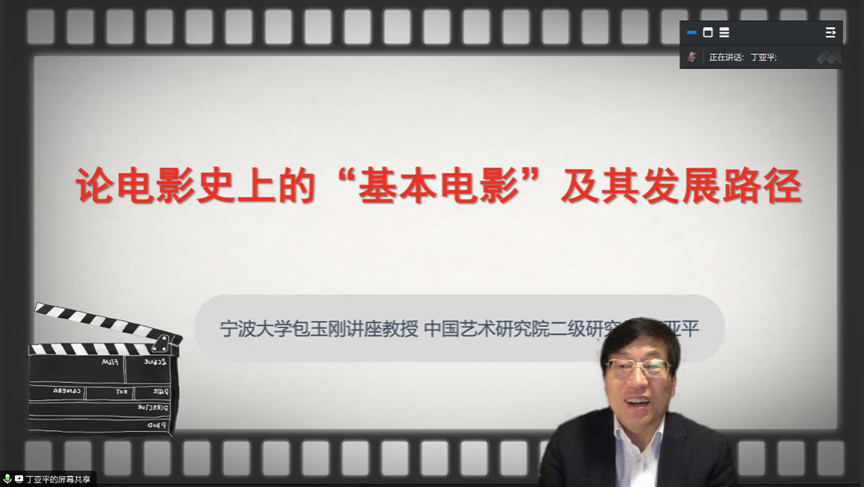 11月6日晚,中国高校影视学会会长、中国传媒大学艺术学部学部长、中国艺术研究院二级研究员、宁波大学包玉刚讲座教授、博士生导师丁亚平老师应邀为我院师生开展了题为《论电影史上的“基本电影”及其发展路径》的线上学术讲座。讲座由新闻传播学系主任张斌宁教授主持。
