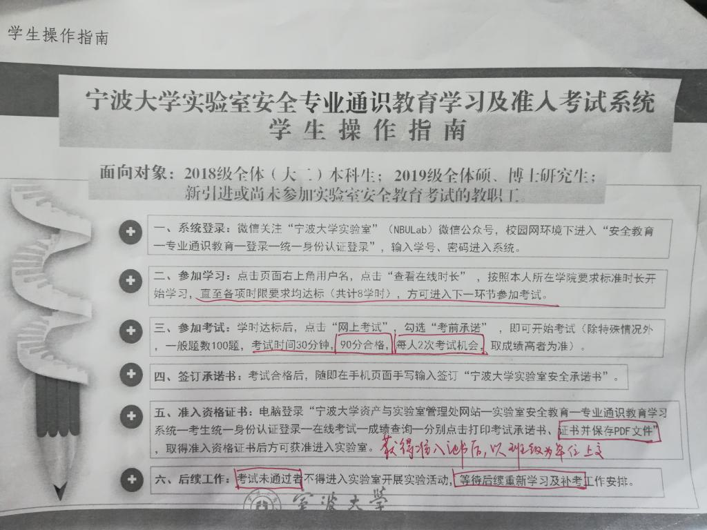 为贯彻落实宁波大学实验室安全教育计划,保证师生的实验室安全。我院现根据学校要求组织学生进行网上学习和考试(学校要求严格实行准入制度,没有通过考试者不得进入实验室学习、工作)。
