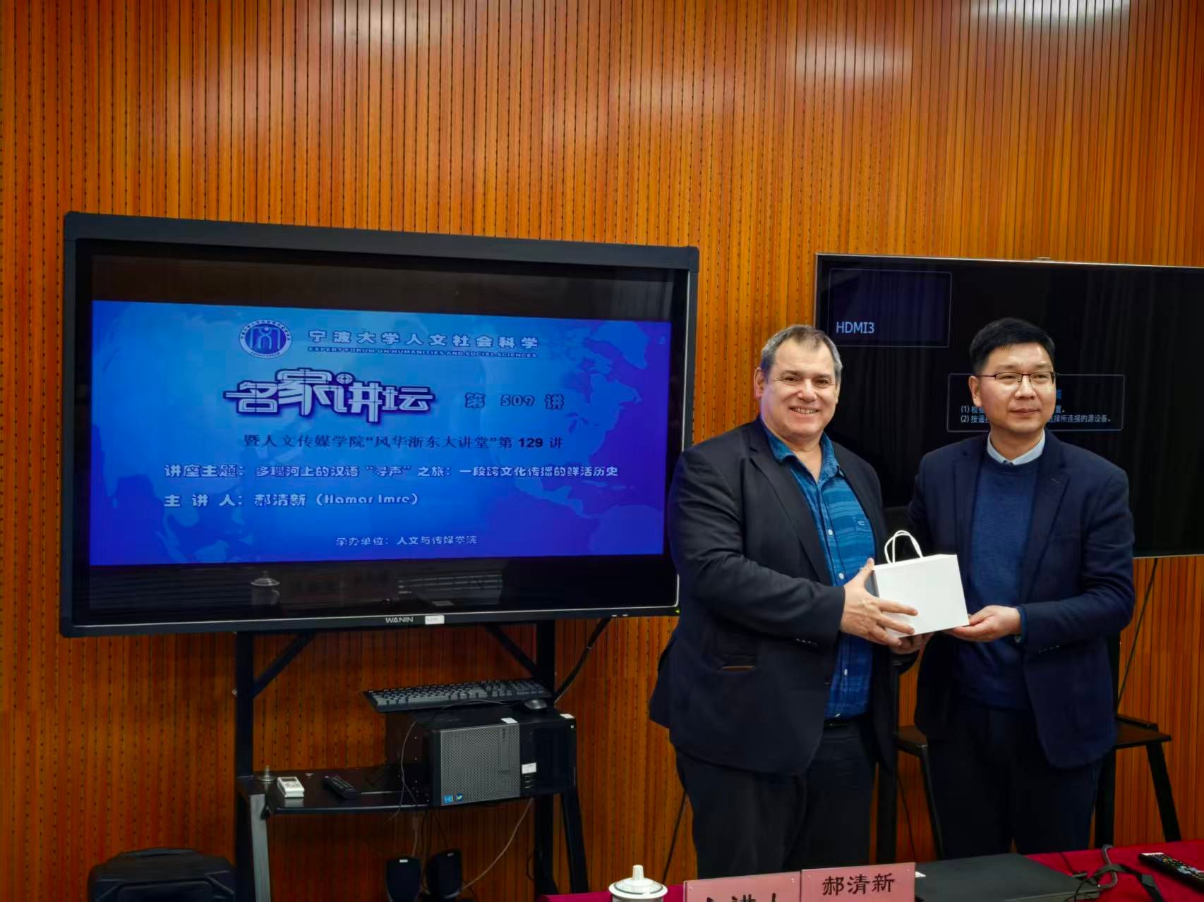 11月19日,宁波大学“人文社会科学名家讲坛”第509讲暨人文与传媒学院“风华浙东大讲堂”第129讲举办。匈牙利科学院院士、罗兰大学副校长郝清新(Hamar Imre)应邀作了题为“多瑙河上的汉语‘寻声’之旅:一段跨文化传播的鲜活历史“的专题讲座。讲座由宁波大学副校长戴世勋主持。