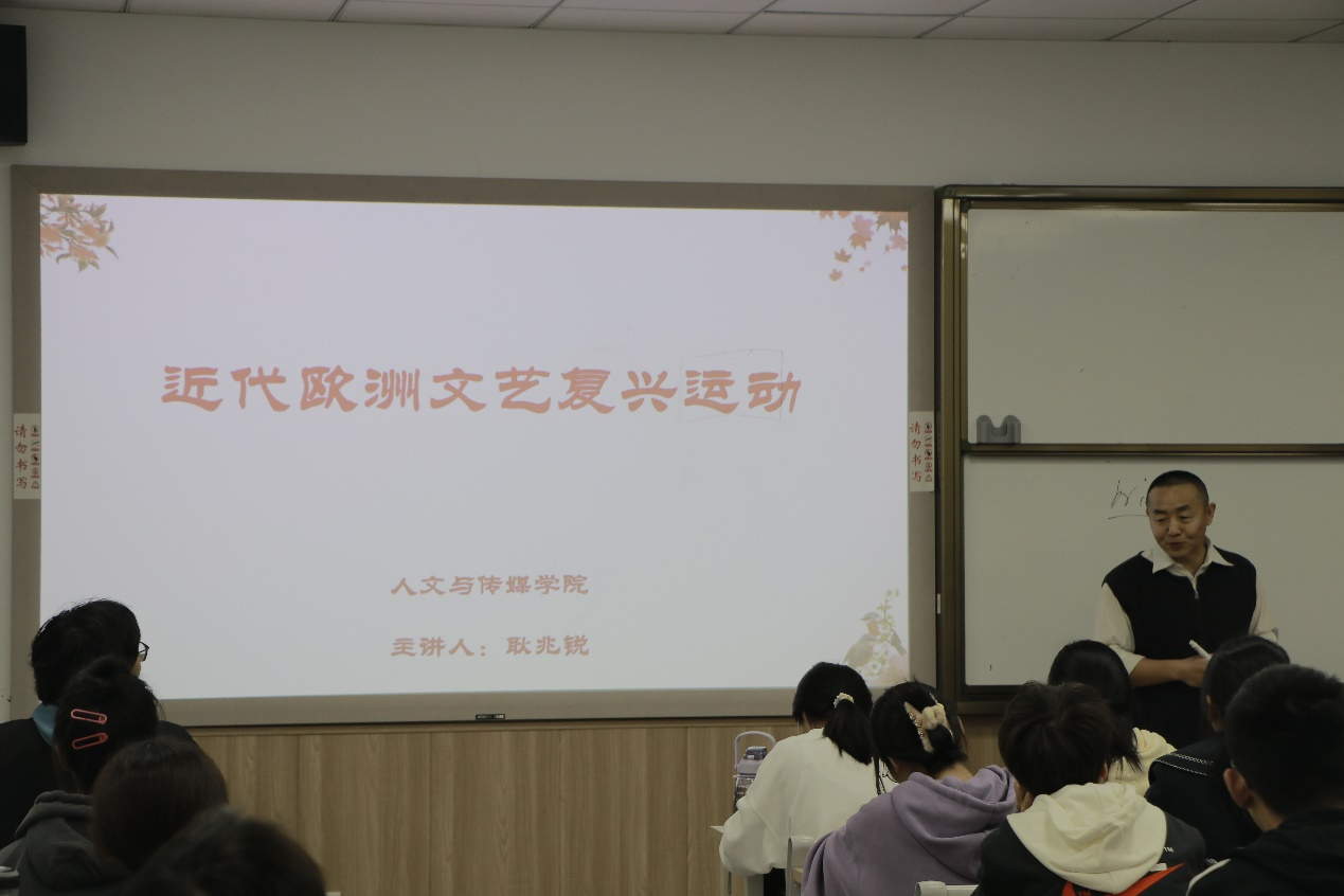 11月24日下午5-6节,我院推荐耿兆锐老师的《世界文明简史》课程,顺利在北区2号教学楼407教室开讲。本次课程主要讲授“近代欧洲文艺复兴运动”,以革命导师恩格斯的名言导入课程,带领学生感受文艺复兴的绮丽多姿。