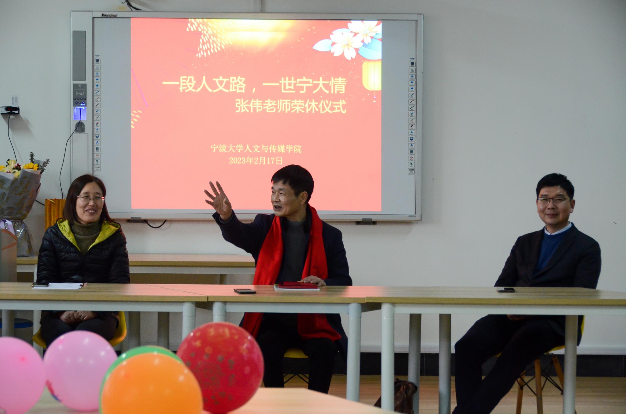 张佩芬书记在致辞中指出,张伟老师在宁波大学三十八年如一日深深扎根于教育事业,一段人文路,一世宁大情。张老师相继担任历史系主任、人文与传媒学院副院长、浙东文化与海外华人研究院院长、人文与传媒学院院长。曾兼任宁波市历史学会秘书长、副会长、浙江省海洋文化与经济研究中心执行主任等职。他醉心教育事业,在教书育人、科学研究、行政工作方面经历着、见证着、推动着学院工作的进步,桃李天下、成绩满满。她希望张老师继续关心、关注和支持学院的各项工作,多为学院建言献策,继续参与和见证学院的各项事业发展。